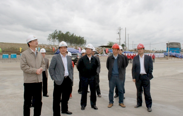 圖為:交通運(yùn)輸廳副廳長(zhǎng)梁毅(右二)、崇左市委書記趙樂秦(右三)、崇左市副市長(zhǎng)張鴻(左一)在項(xiàng)目現(xiàn)場(chǎng)檢查調(diào)研