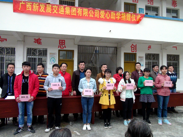 當日,集團公司在豹山村舉行愛心助學捐贈儀式,掛牌成立了廣西新發(fā)展交通集團愛心助學基金會,向扶貧聯(lián)系點200多名貧困學子捐資助學獻愛心。劉明洪副總經(jīng)理殷切希望貧困學子們努力學習,常懷感恩之心,學好本領(lǐng),將來回報家鄉(xiāng)、回報社會。