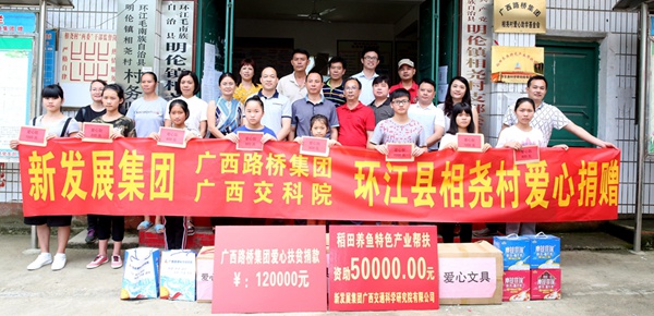 8月18日,廣西新發(fā)展交通集團到環(huán)江縣明倫鎮(zhèn)相堯村開展愛心助學(xué)金和產(chǎn)業(yè)發(fā)展基金捐贈活動,向相堯村貧困學(xué)子捐贈文體用品、學(xué)習(xí)用具、愛心款,資助相堯村稻田養(yǎng)魚特色產(chǎn)業(yè)。