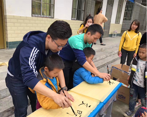 集團公司青年團干在游園活動中教學(xué)生寫毛筆字