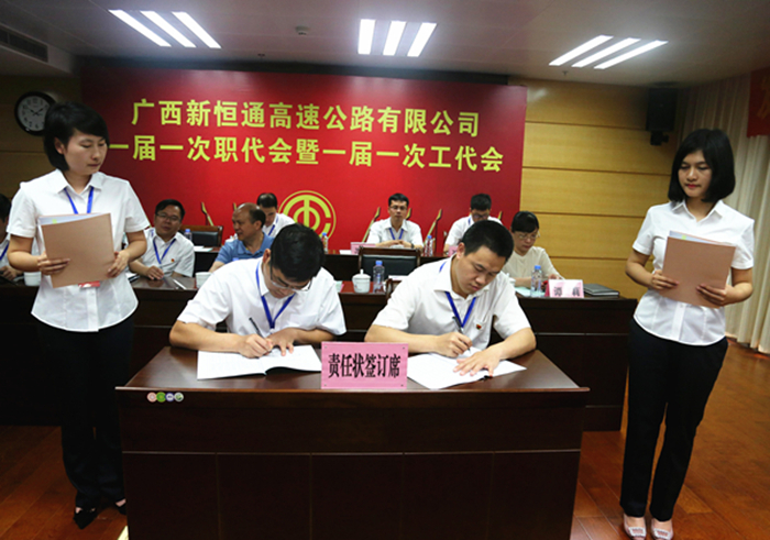 4月4日上午,新恒通公司一屆一次職代會暨一屆一次工代會勝利召開。會議全面貫徹落實黨的十九大及全國、全區(qū)交通工作會議和集團公司2018年工作會議精神,全面總結(jié)公司成立三年來的工作,明確和部署2018年各項重點工作,共謀公司發(fā)展大計,為奮力開創(chuàng)新時代“縣縣通”高速公路建設事業(yè)新局面而努力奮斗。集團公司領導出席會議并發(fā)表講話,集團公司派駐監(jiān)事會成員、41名正式代表、3名列席代表參加會議。公司黨委副書記、工會主席梁波主持會議。